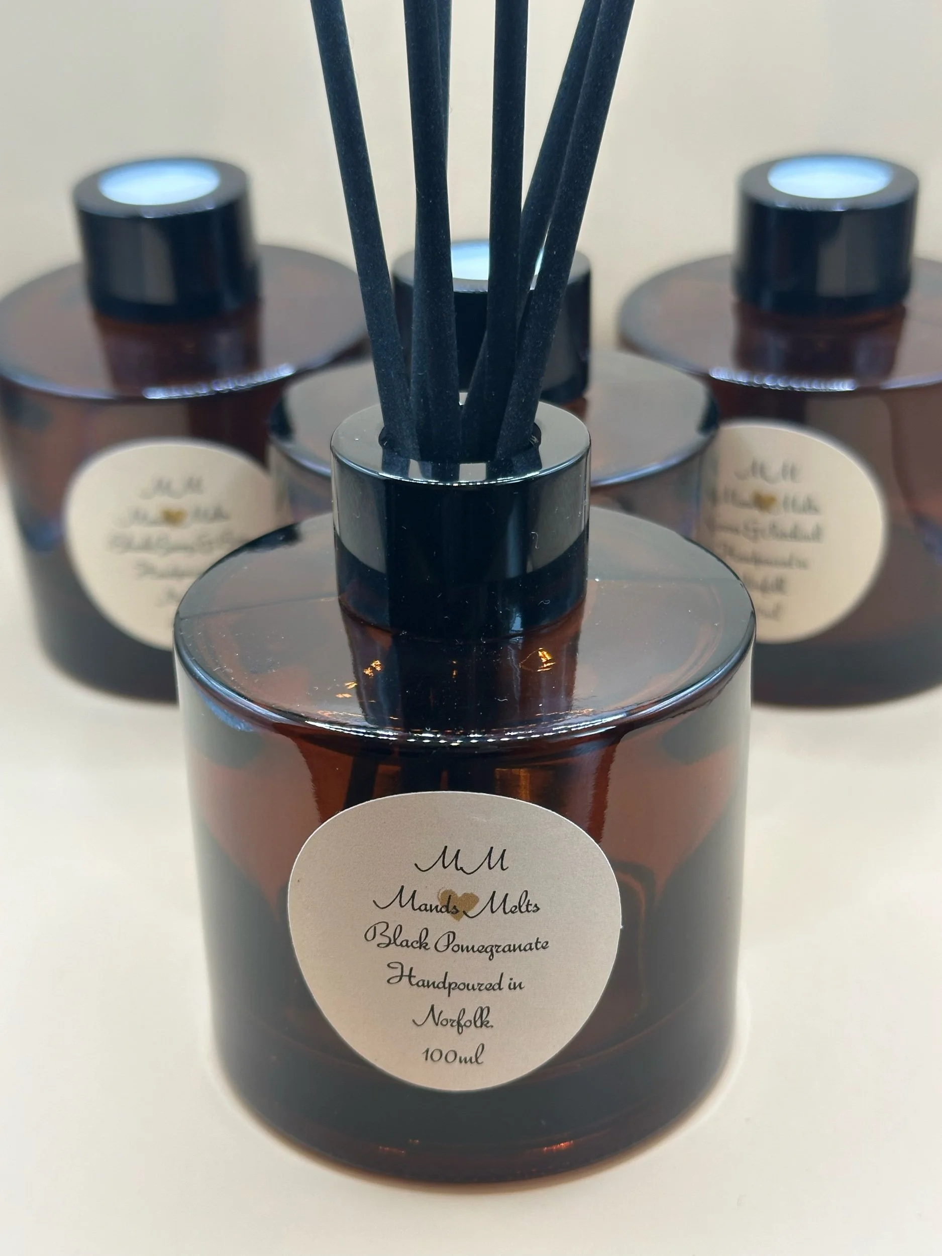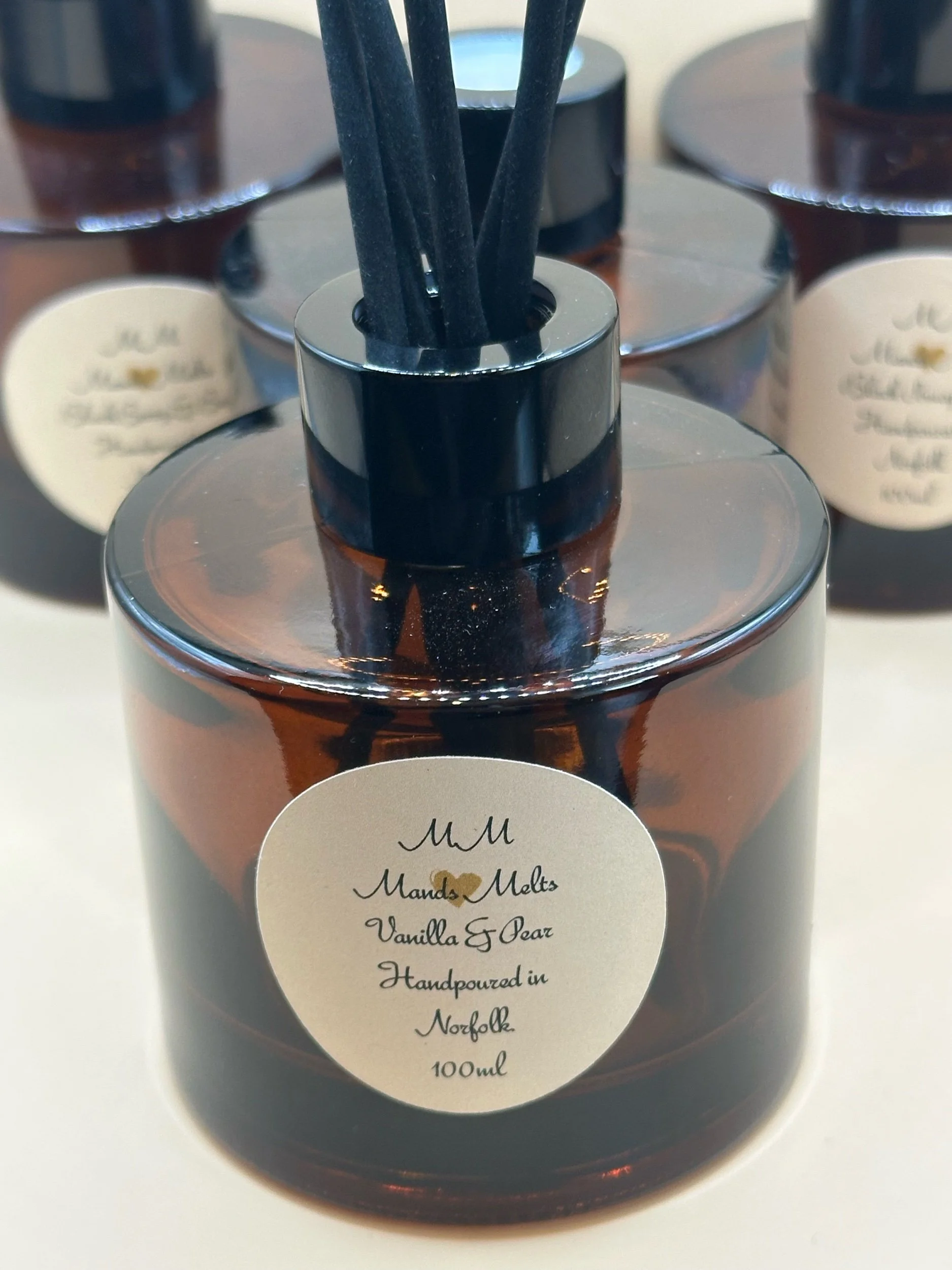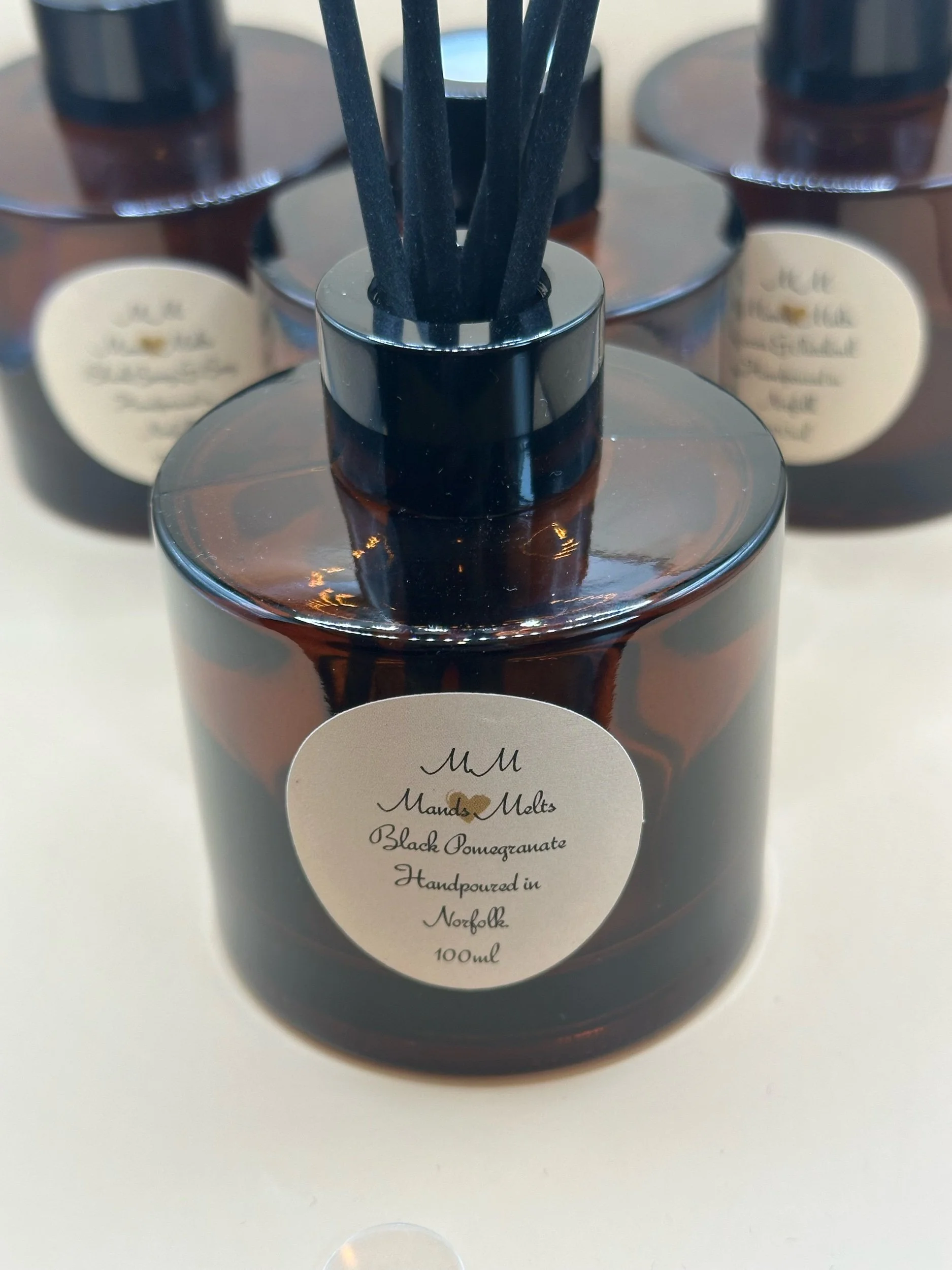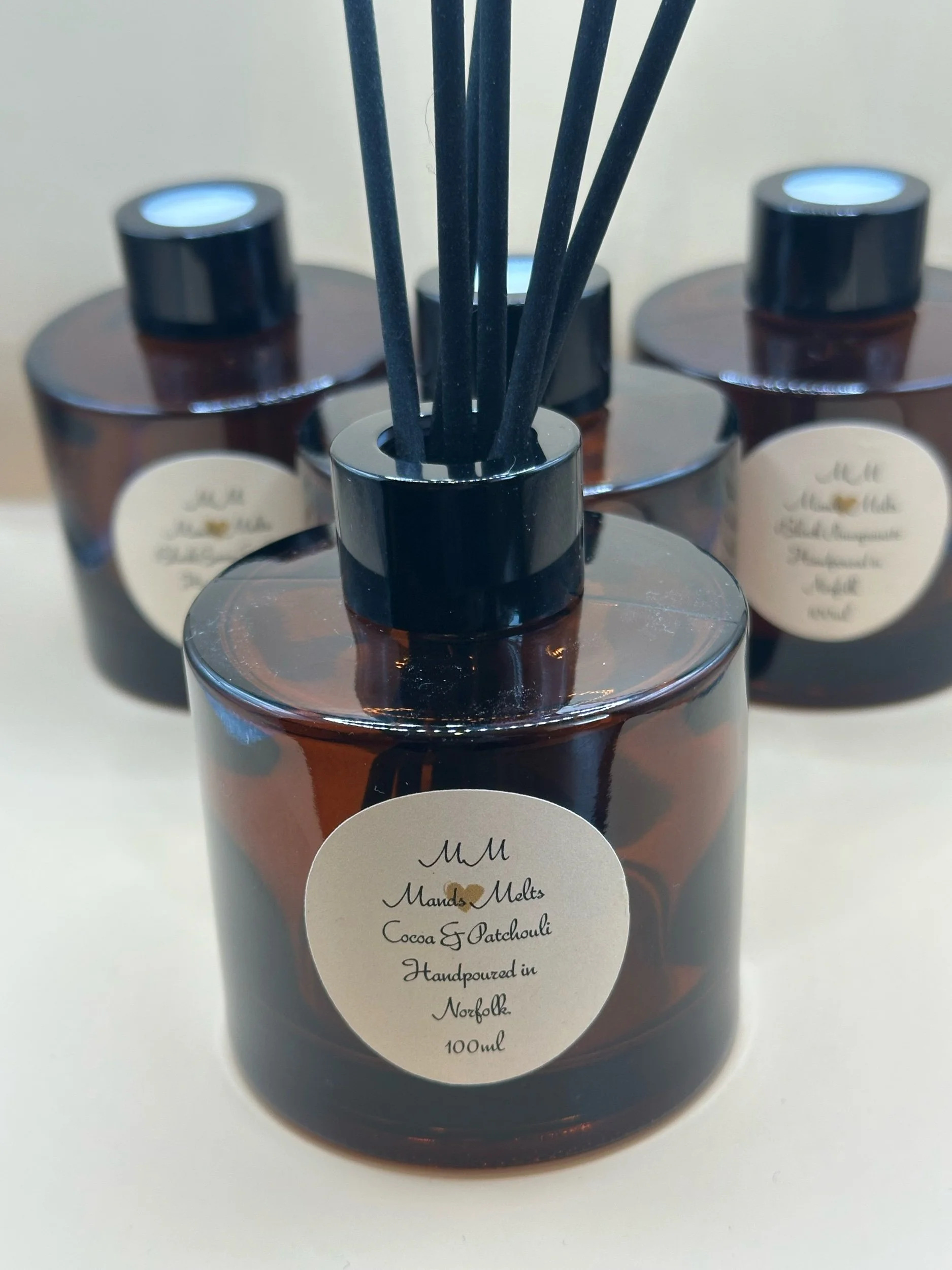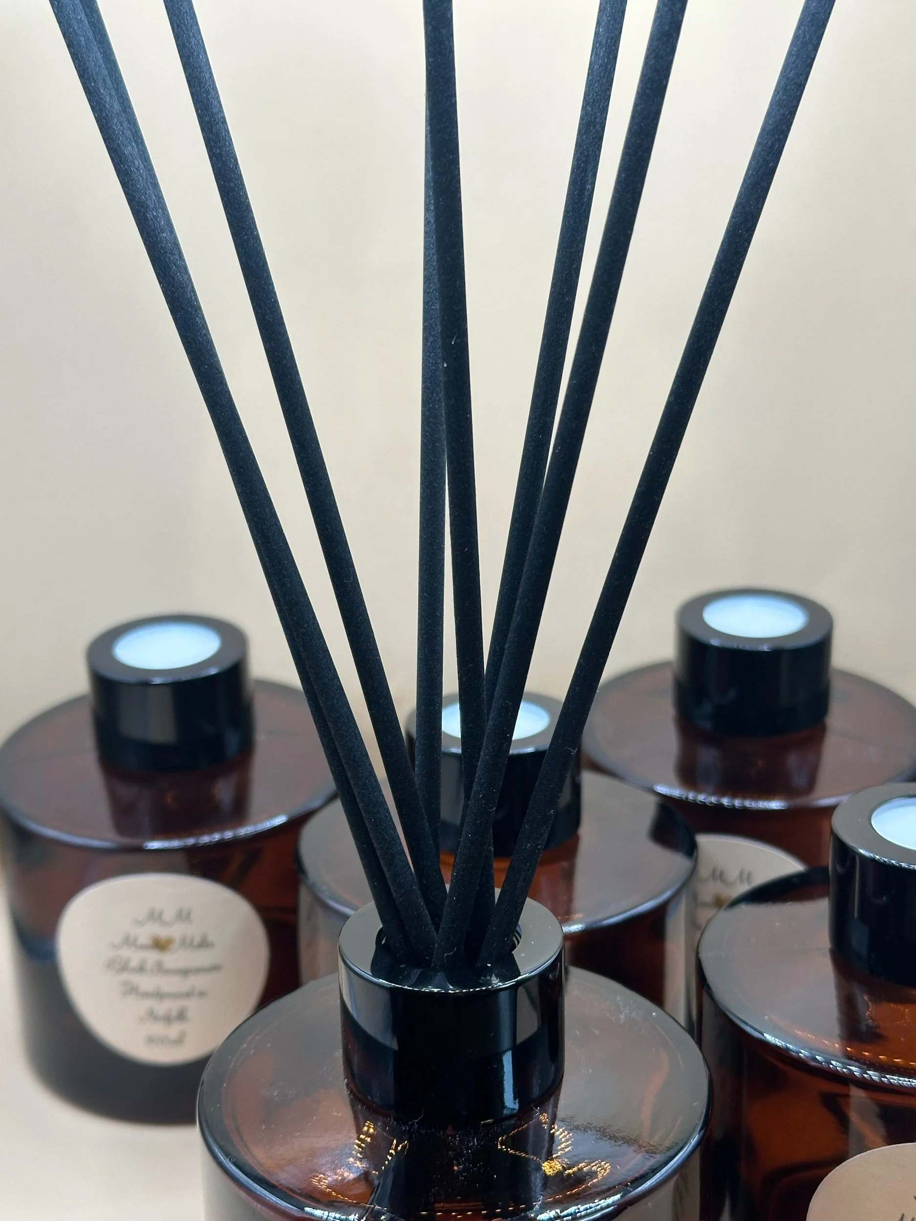 Transform your home fragrance with our elegant reed diffusers, they come in a beautiful Amber glass apothecary jar, to match our candles as well as a black lid & fibre reeds.